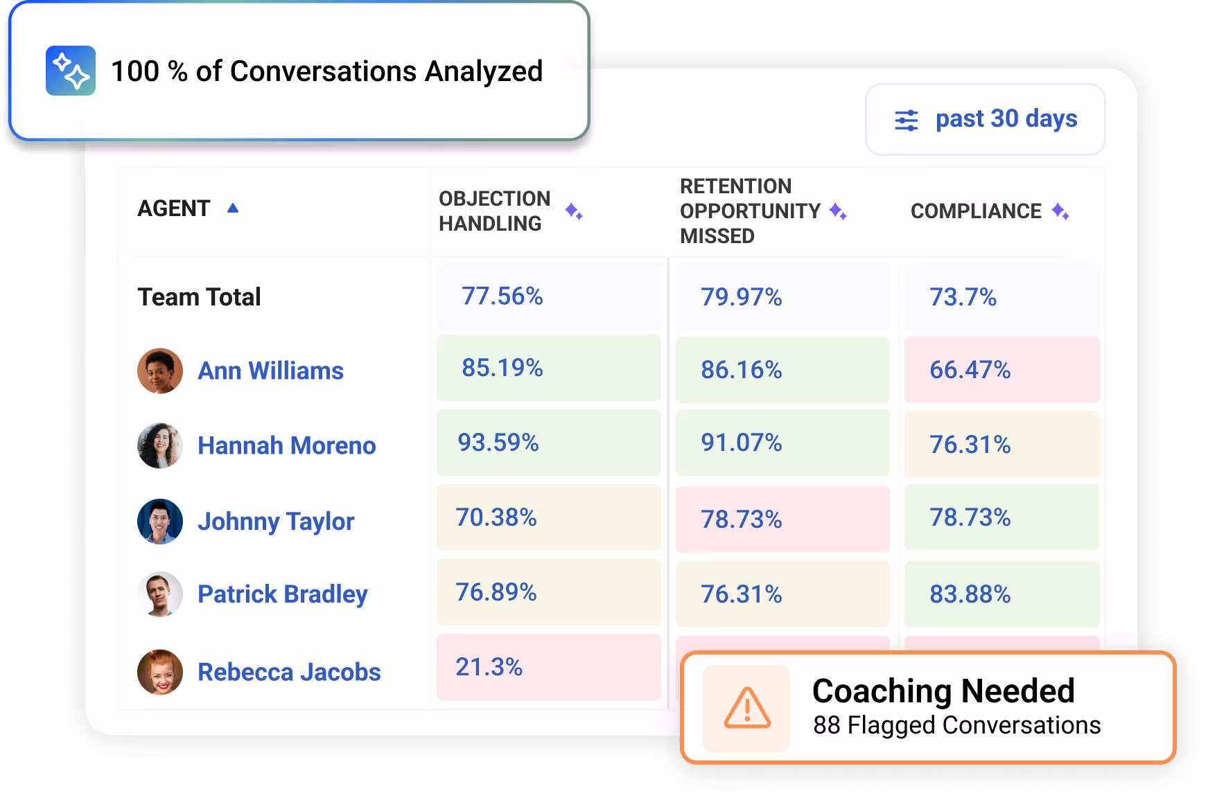 Customizable templates, embedded conversation examples, and AI-assisted reviews take the heavy lift out of coaching prep. Managers spend less time searching for material and more time having focused conversations that agents can immediately apply in their day-to-day work.