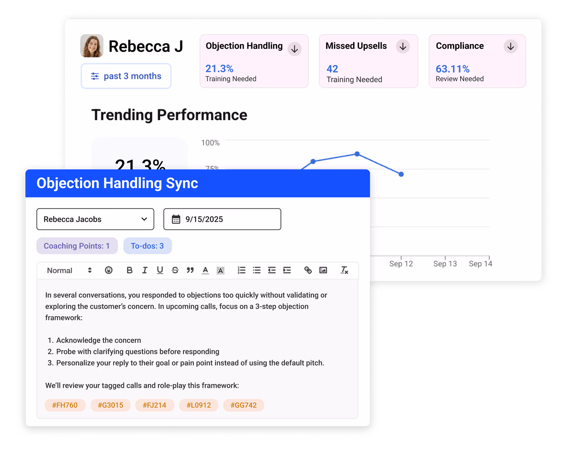 Coaching doesn’t stop when the session ends. Assign to-dos and follow-ups tied to real interactions, then track progress across future conversations and key performance metrics—like conversion rates, compliance adherence, efficiency, or customer outcomes. Agents know exactly where to improve, and leaders can see if feedback is driving change.