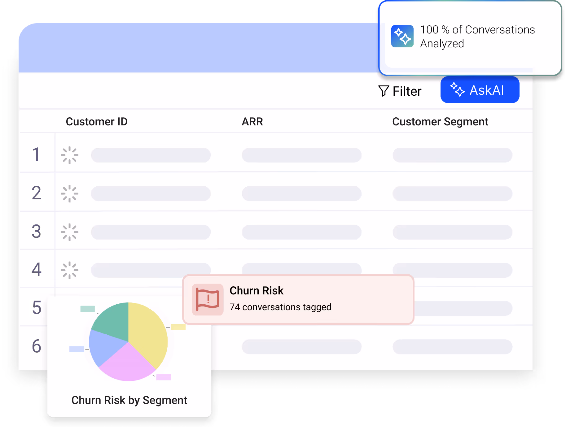 When churn risk spikes or escalations rise, AskAI lets teams investigate instantly. Filter to the conversations that matter, ask targeted questions about cancellation intent or product complaints, and layer follow-up questions to uncover root causes. Whether you’re analyzing thousands of interactions or a single case, AskAI delivers fast, explainable answers so you can act before issues spread.