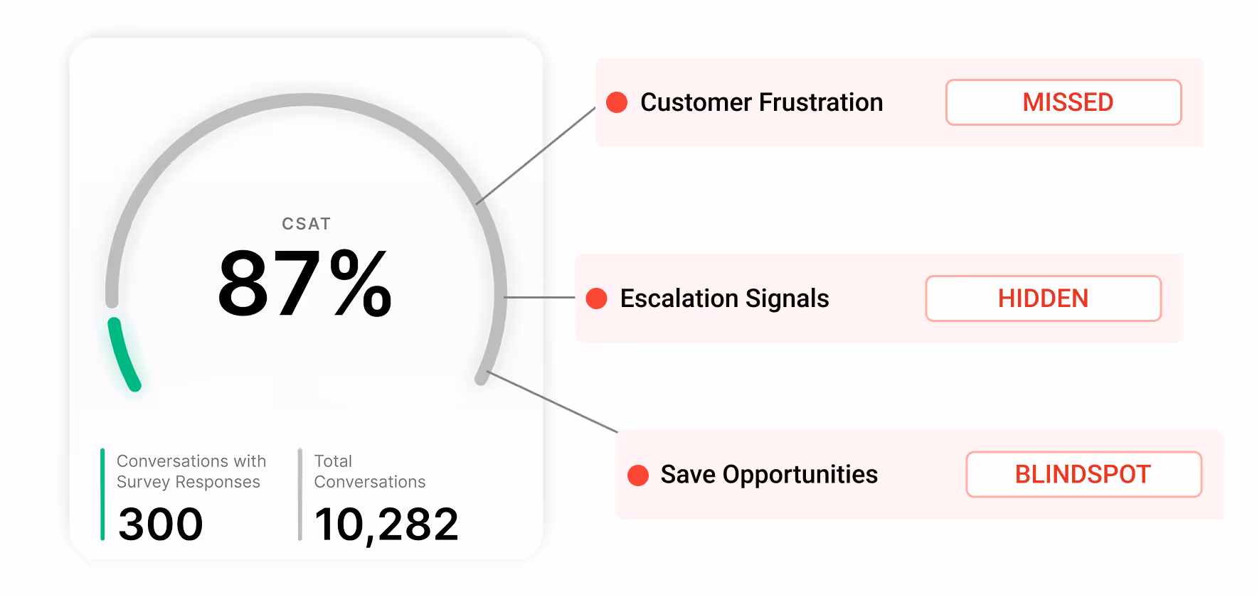 Most teams rely on lagging indicators like NPS, CSAT, or random QA samples to spot unhappy customers. That leaves the majority of signals—frustrated chats, missed save opportunities, and subtle escalation cues—hidden in unreviewed interactions. Without visibility, churn prevention becomes reactive, not proactive, and escalations are handled only after damage is done.